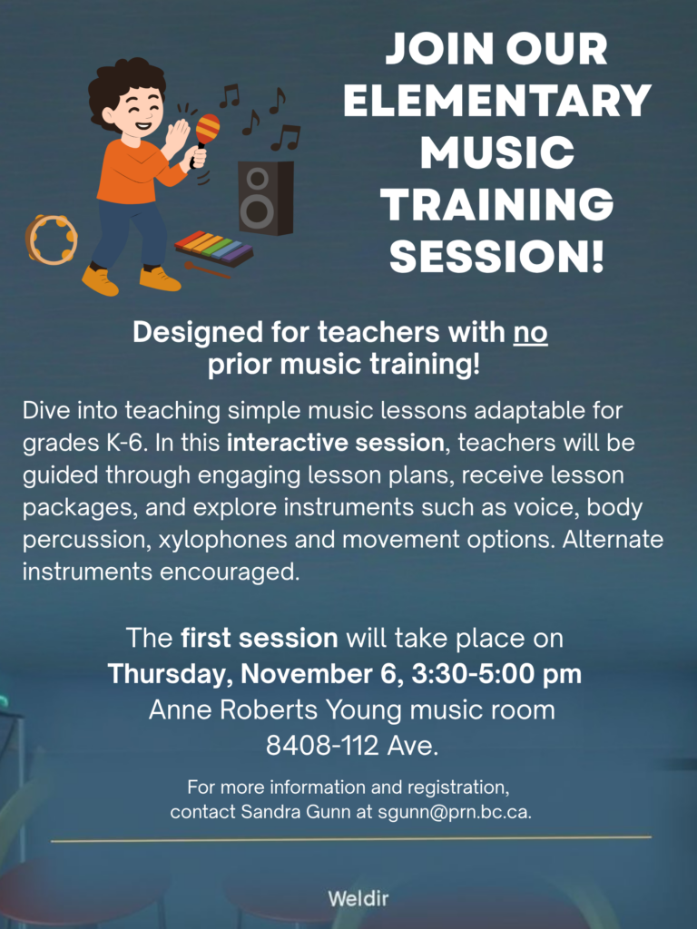 Elem. Music Training for Non-Musicians https://lt.prn.bc.ca/elem-music-training-for-non-musicians/ Tue, 23 Sep 2025 18:00:41 +0000 https://lt.prn.bc.ca/?p=2613 Elementary music training for non- musicians 1st session: Thursday, Oct. 2nd 3:30-5:00pm Anne Roberts Young music room 8408-112 Ave, Fort St John Sessions are an in-depth run-through of music lessons that can be adapted for grades K to 6. No prior music training is needed. Participants will be walked through the specifcs of each lesson […]