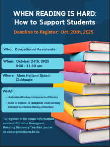 Please register by emailing Christine Bourgeois, District Teacher Leader for Reading Recovery at cbourgeois@prn.bc.ca